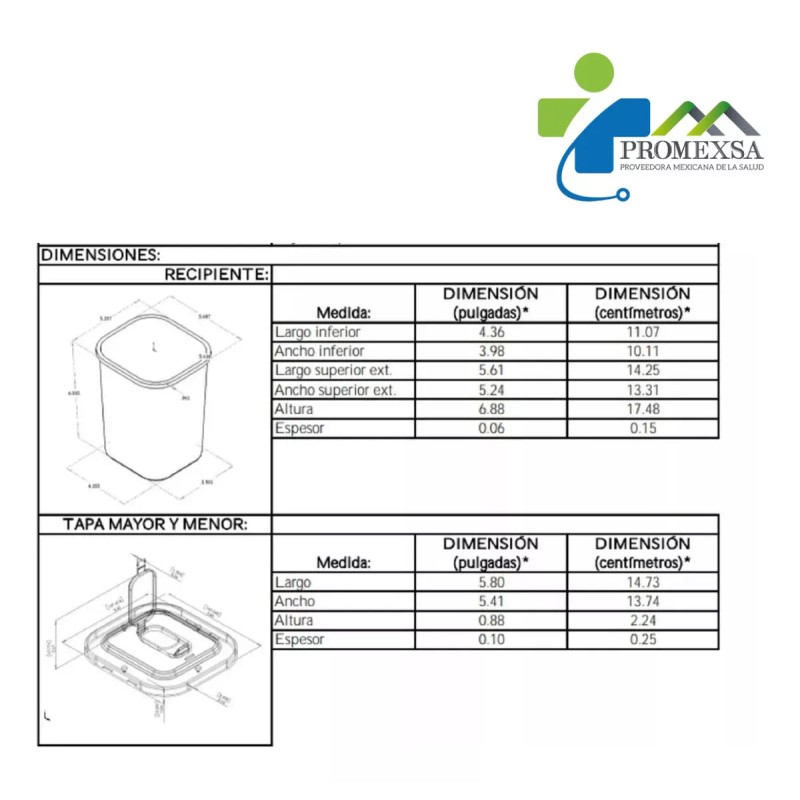 Permite el desecho seguro de: Jeringas, agujas de biopsia, agujas de sutura, ámpulas, asas, cristalería de laboratorio rota, bisturís, lancetas, navajas, punzón de drenovac, restos de alambres o cualquier otro elemento punzocortante. Cuando se encuentre lleno a su capacidad máxima indicada en el recipiente, éste deberá ser desechado de acuerdo a la NOM-087- ECOL-SSA1-2002, la cual menciona que se debe esterilizar e incinerar al término de su uso.