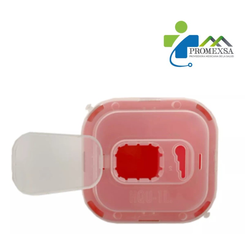 -Tapa mayor con apertura para tirar los residuos y separador de agujas. Transparente permitiendo ver el volumen de llenado.