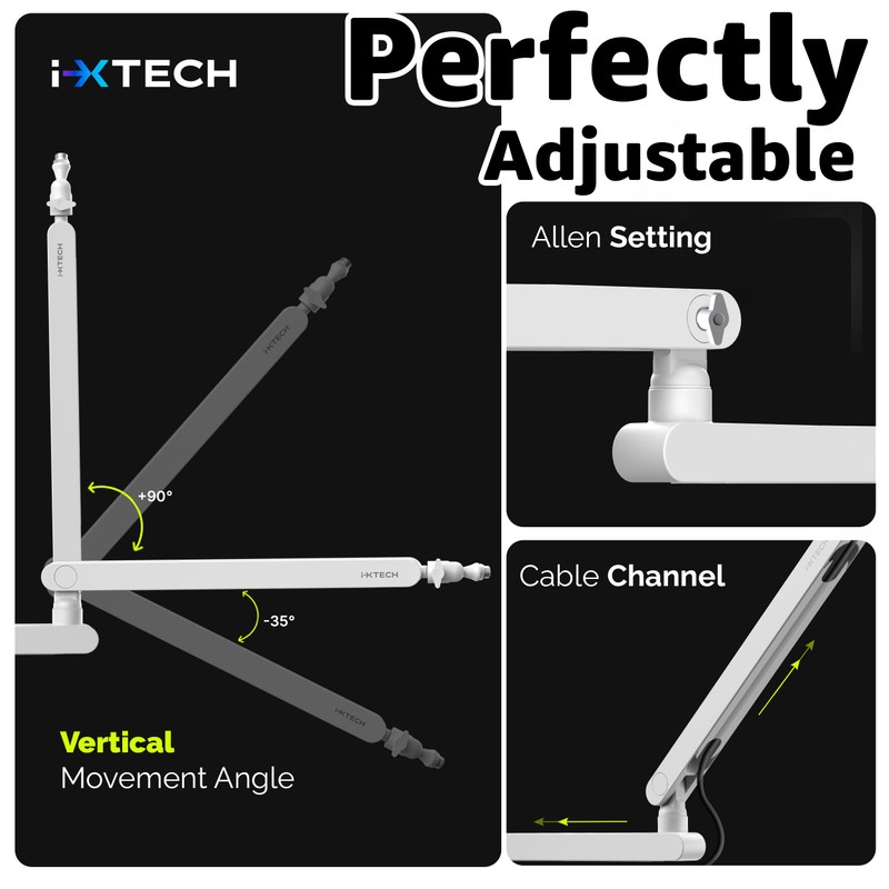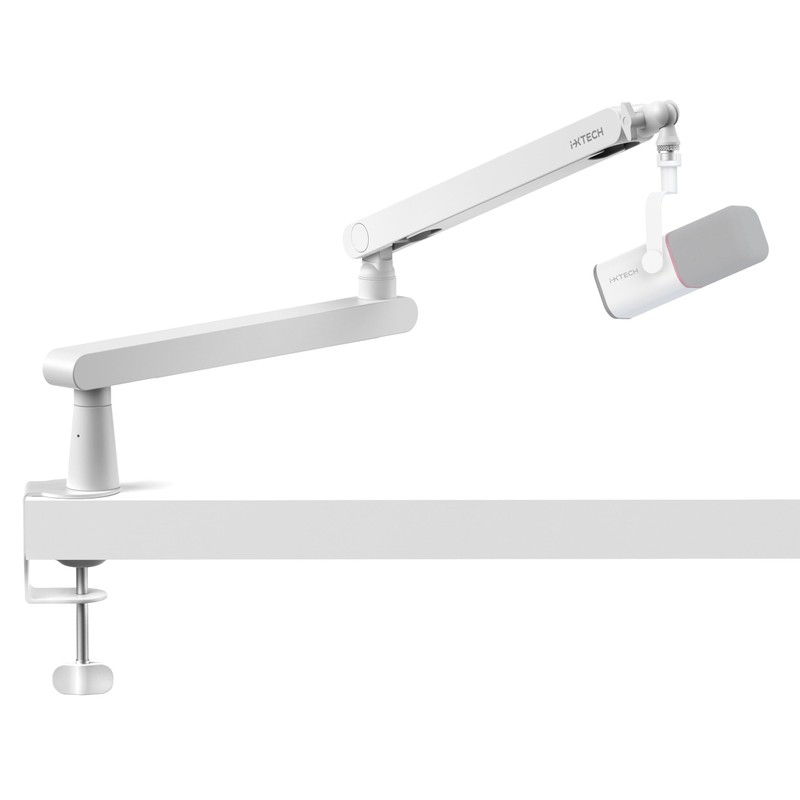 IXTECH White Microphone Boom Arm Stand Low Profile Boom Arm Adjustable Mic Stand with Built In Cable Management 360° Swivel Mic Arm.