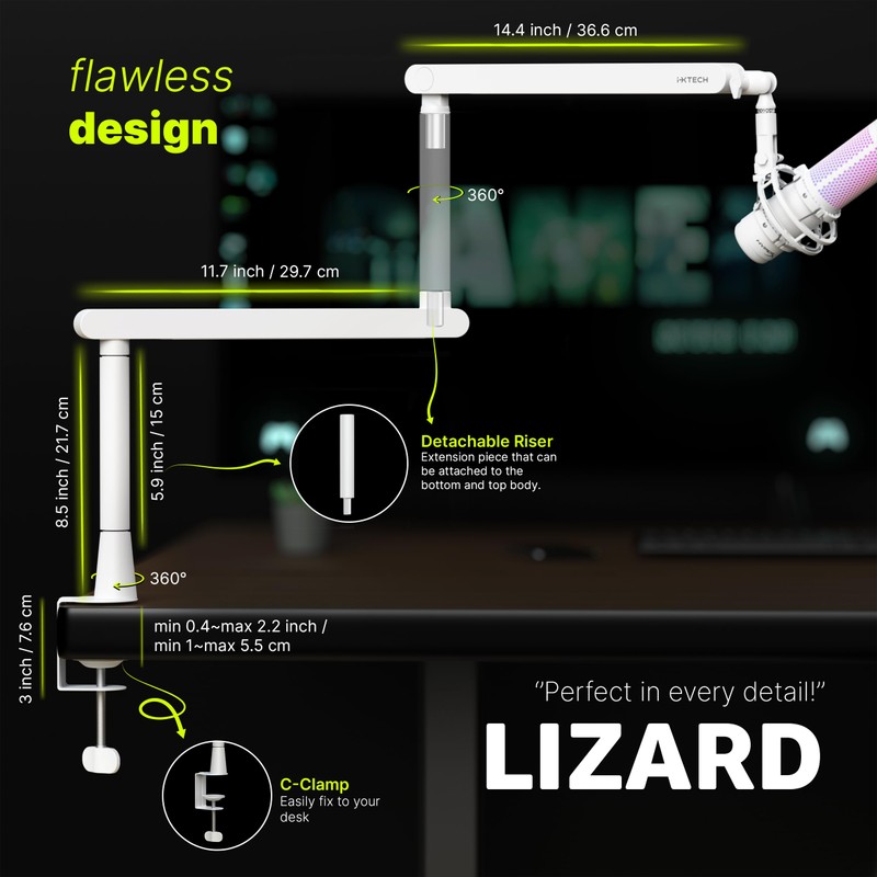 - Low Profile Design: The white mic arm desk mount uses a low profile design so you can use it from under your monitor and offers an adjustable height from 5.7" to 27.8". We also include a detachable rise column to offer more height making it ideal for any setup.