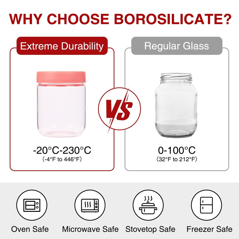 - Freezer-to-Oven Safe Glass Jars: Premium borosilicate glass withstands -4℉ to 446℉ for freezer meal prep, overnight oats, reheating soups, or baking. Pro Tip: Leave 1" space when freezing for expansion. 16oz jars work as portion control containers,yogurt parfait cups with lids. Shatter-resistant & microwave-safe lunch jars (lids removed)