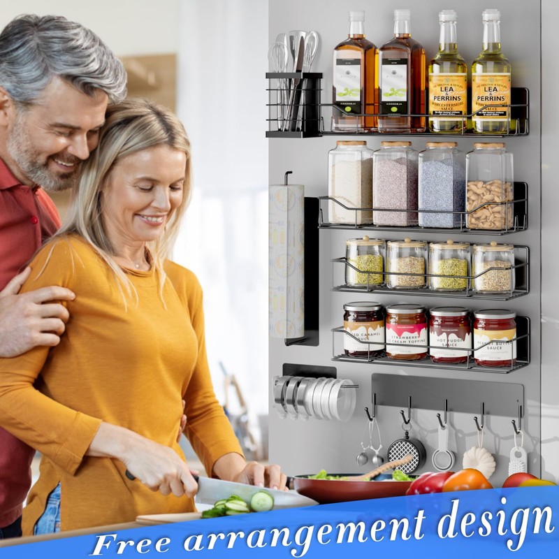 IYEBAU Magnetic Spice Rack for Refrigerator,8 Pack Magnetic Fridge Shelf, Moveable Spice Organizer with Hook Rack, Paper Towel Holder, Utensil Holder,cup lid holder, Super Magnetic Rack Set (Black)