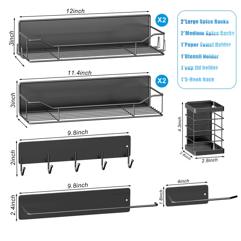 - 【8 Packs Kitchen Organizer Set】Kit includes:2*Large Spice Racks, 2*Medium Spice Racks, 1*Paper Towel Holder, 1*Utensil Holder,1*cup lid holder,1*5-Hook Rack. It fulfills your need for extra storage to make your home or kitchen save space with look more beautiful.