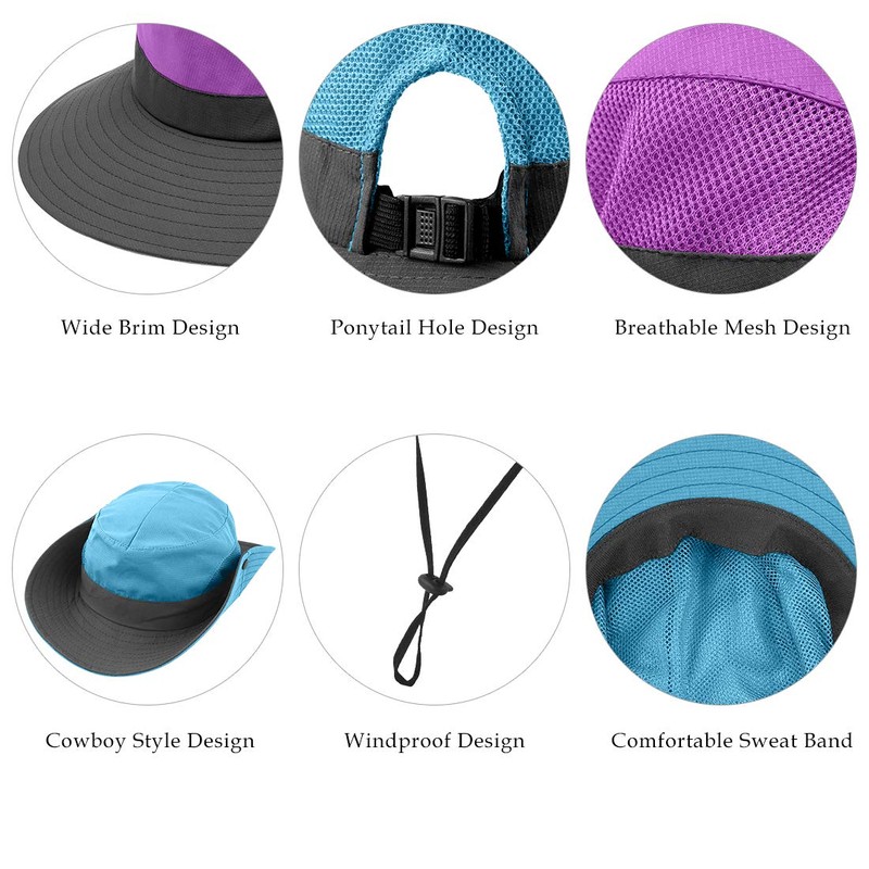 IYEBRAO Pack of 2 Ponytail Sun Hat Women's UV Protection Wide Brim Summer Hat with Neck Cord Sun Protection Hat Beach Hat Fishing Hat Fishing Hat Garden Hat Outdoor Hat, Purple+Blue 2pcs