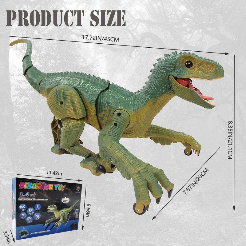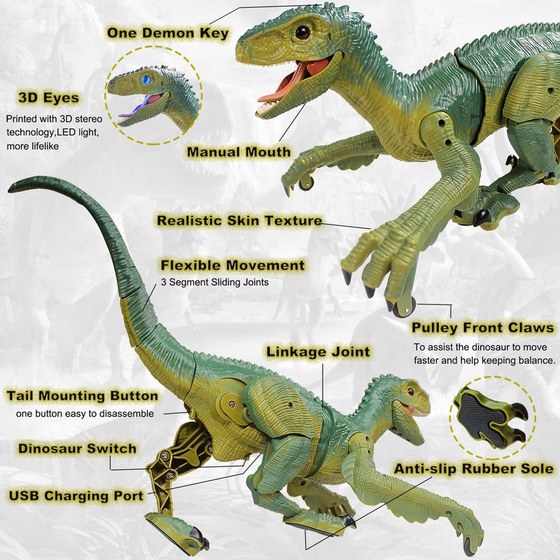 • 🔋【Durable Rechargeable Battery】Remote controller requires 2x1.5V 'AA' (not included). Our RC velociraptor built-in rechargeable lithium battery is 3.7V 1200mah. After being fully charged with the USB cable, the dinosaur robot toy can last up to 2 hours of operation. Allowing your kids to experience a longer and uninterrupted gaming time.