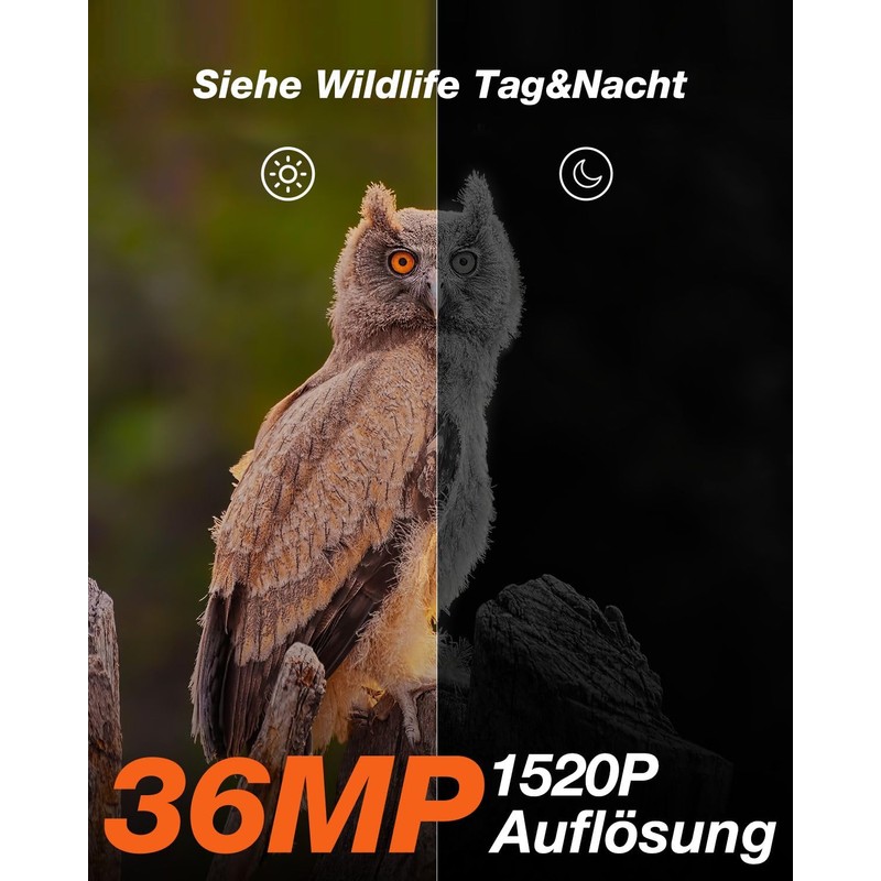 - Ultra-high 1520P 30fps 36MP resolution and advanced no-glow night vision: 1520P 30fps 36MP ultra-high resolution ensures that the wildlife camera takes excellent images and clear audible videos and presents rich details in the photos and footage. With the no-glow night vision function, recordings are made silent without disturbing animals. You will never miss a shot. (The video format is AVI. The use of Potplayer/KM Player is recommended.)
