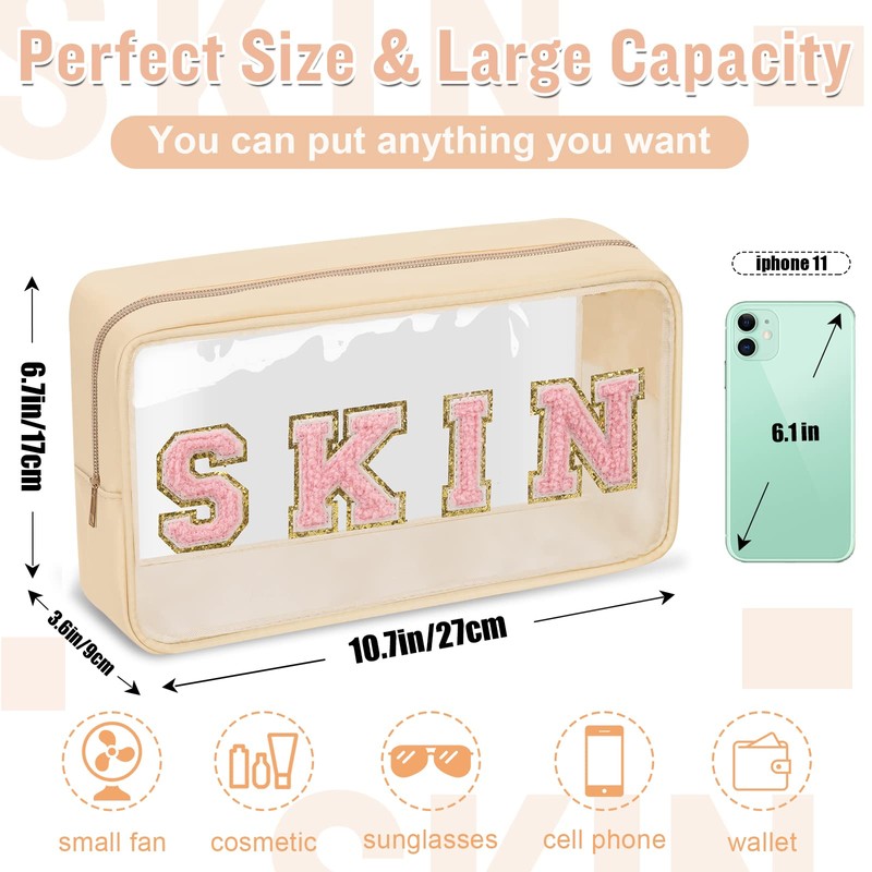 izuzta Bolsa de maquillaje Preppy Patch, bolsas de maquillaje transparentes con cierre, Piel-beige