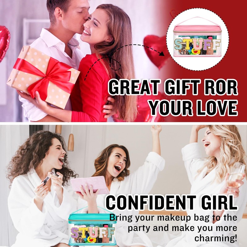 - ❤【Bolsa transparente de chenilla con purpurina】2 bolsas de maquillaje Preppy tienen parches dorados con letras y las letras están hechas de delicados bordados de toalla y tela no tejida. Manchas firmemente en la bolsa, no tienes que preocuparte por que se caigan. Estas coloridas letras tienen un borde dorado con purpurina para hacer que tu bolsa de maquillaje transparente se vea muy brillante y vívida