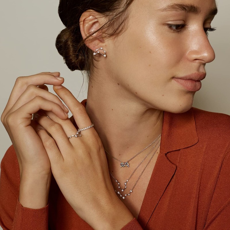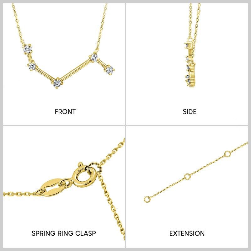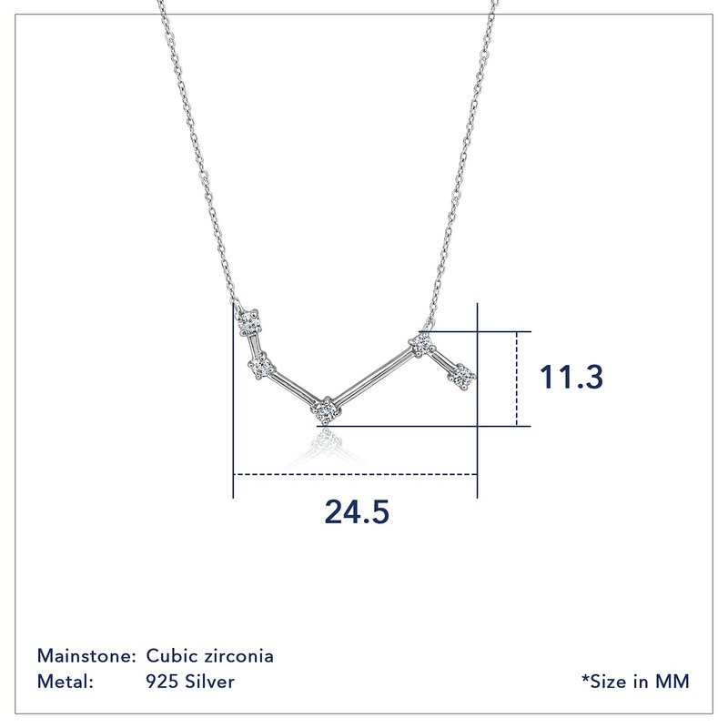 • Celebrate her zodiac sign with this shimmering Cubic Zirconia inspiration necklace. Crafted in sterling silver, this petite constellation is created with sparkling round Cubic Zirconia connected by silver bars. Radiant with a bright polished shine, this constellation suspends centered along an 18.0-inch cable chain that secures with a spring-ring clasp.