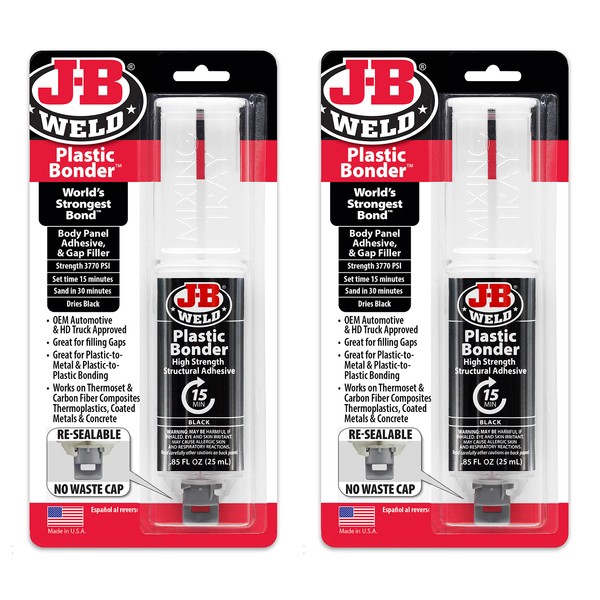 - J-B Weld Plasticbonder (Black): A Quick Setting And Multipurpose Two Part Urethane Adhesive & Gap Filling System That Provides A Strong And Lasting Bond To Many Plastic Surfaces J-B Weld Plasticbonder Is Great For Diy Plastic Repairs, Filling Dents, Bumper Repairs And More. J-B Weld Plasticbonder comes in Syringe allowing for a 1: 1 Mix Ratio. The Unique Syringe Has A Re-Sealable Cap That Prevents Drying Out And Leaking, Allowing For Multiple Uses