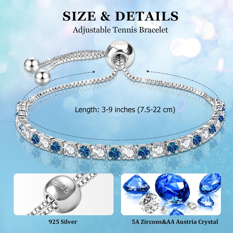 - Classic and stylish adjustable sterling silver bracelet: The bracelet is in classic tennis style and inlaid with blue crystal and clear 5A zirconia. The mysterious and bright blue crystal makes the bracelet more unique and fashionable compared to a normal tennis bracelet and gives the wearer a unique brilliance. It is an ideal gift for a girlfriend, wife, mother, good friends, bridesmaids and bride