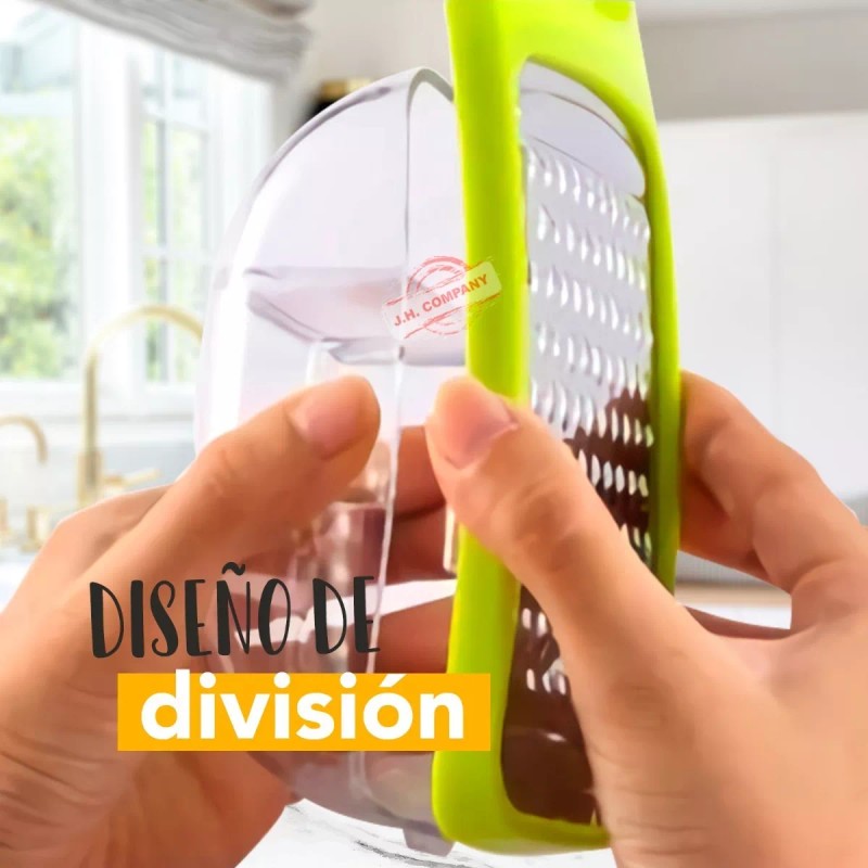 Equipado con un contenedor ajustado a presión que se ensambla a la perfección en la parte trasera del rayador, siendo transparente y de gran capacidad para que puedas ver la cantidad de alimento que has procesado en el rayador.