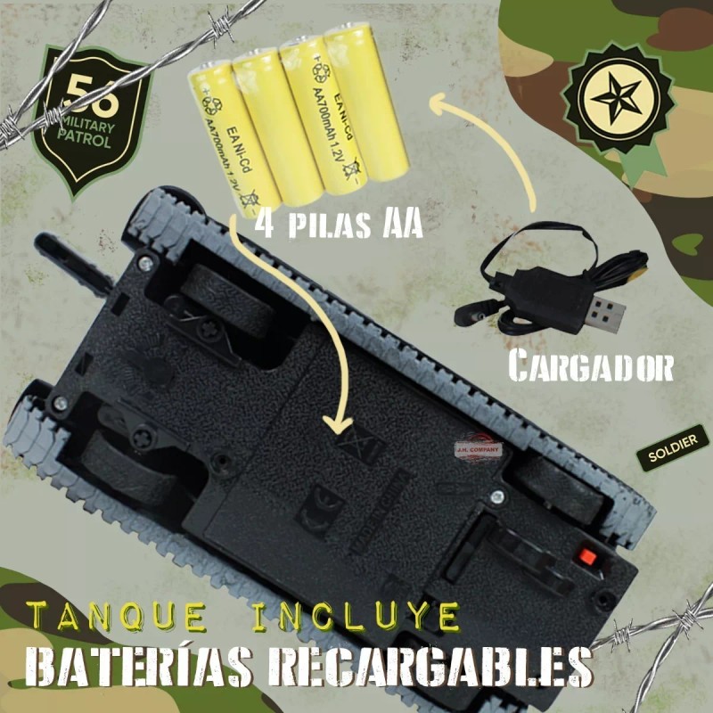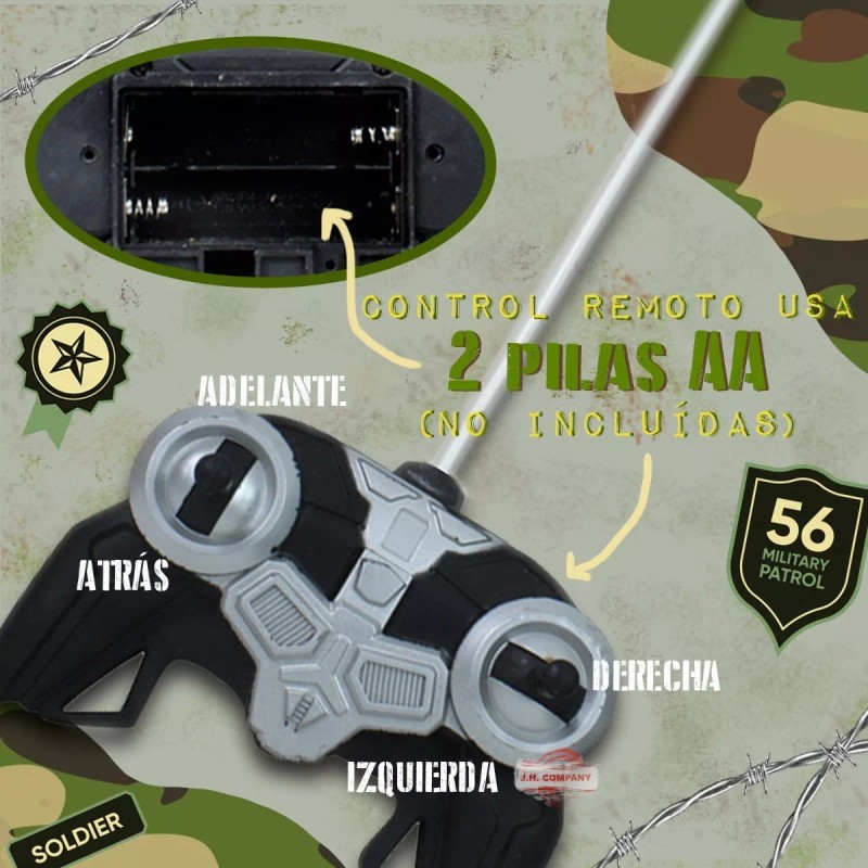 Fantástico coche funcional: Su carrocería con apariencia de tanque de guerra hará volar tu imaginación pensando que estas en el campo de batalla. Con un control remoto de 27 MHz, fácil de entender y manejar consta de dos balancines, derecha e izquierda, adelante y atrás, y accionándolos al mismo tiempo te da un giro de 360º, tendrás una buena sensación de manejo. Con la velocidad más rápida de 10 MPH serán horas de diversión. Puede simular tener tu propio tanque de guerra con un motor verdaderamente potente.