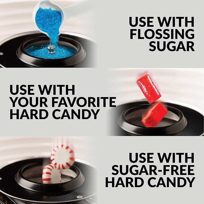 - CREATE & ENJOY - It takes only minutes to get sugar sweets spinning and ready to enjoy. Easily create cotton candy cones, hard candies & sugar floss.