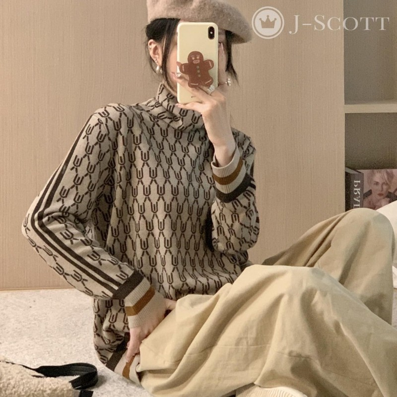 J-Scott JS121 Women's Knit, Geometric Pattern, High Neck Sweater, Long Sleeve, Drop Shoulder, Pullover, Line, beige, M