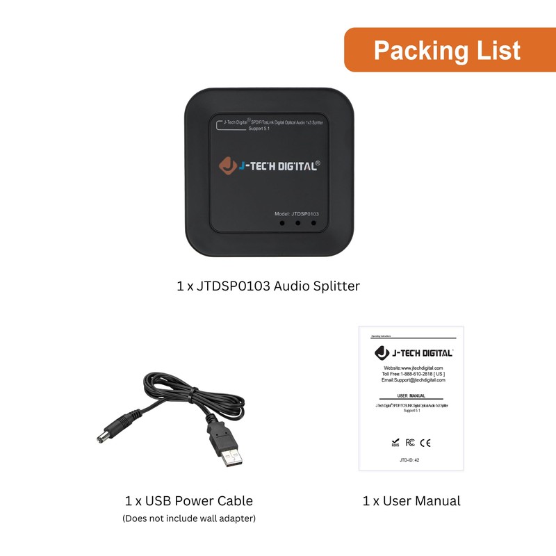 J-Tech Digital Optical Splitter 1 in 3 out for TV, Toslink Splitter 1x3 SPDIF Audio Splitter 1:1 Transmission Support LPCM2.0, DTS, Dolby Digital