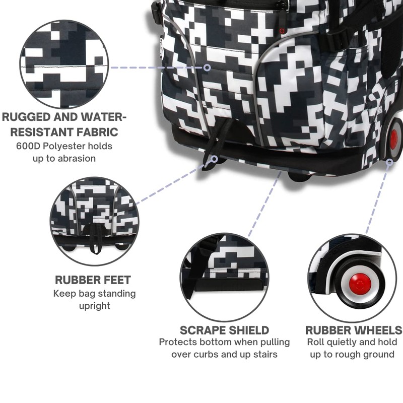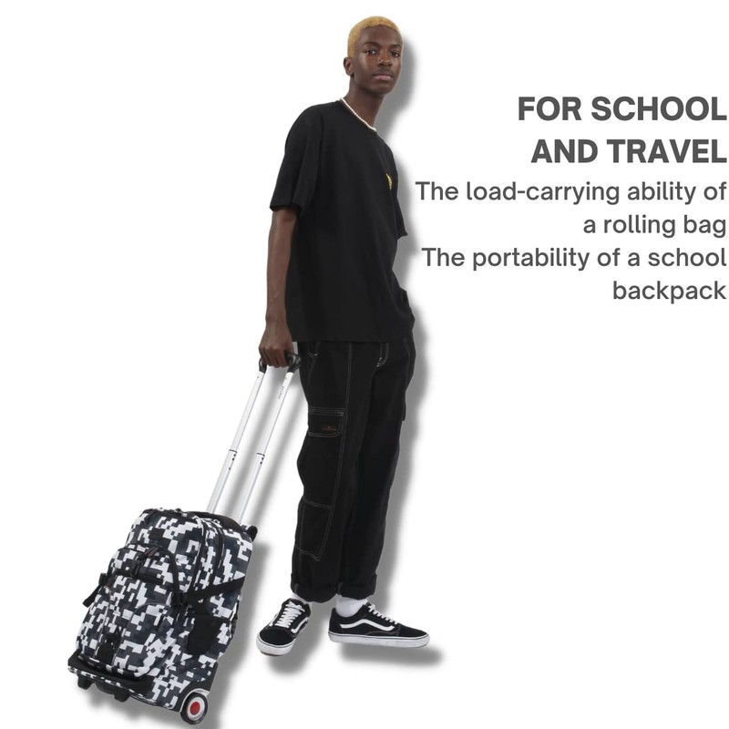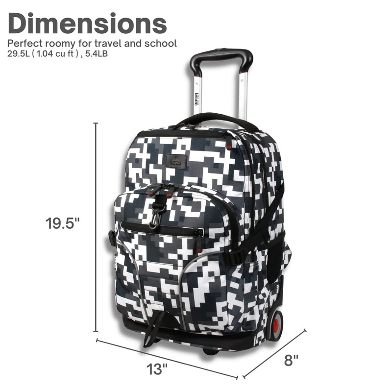 • [Large Backpack With Wheels ] This 19.5” rolling backpack for school and travel offers the load carrying ability of a rolling suitcase and the portability of a school bookbag. For teens and adults who carry a lot of stuff