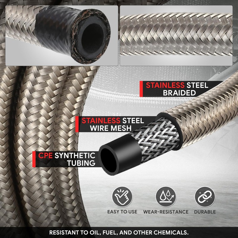 - 【6AN Fuel Line】Stainless steel braiding protects fuel lines against abrasion and wear; High-quality CPE material resists deterioration and maintains flexibility; Resistant to oil, fuel, and other chemicals; Offers excellent fuel flow and pressure continuity for enhanced engine performance