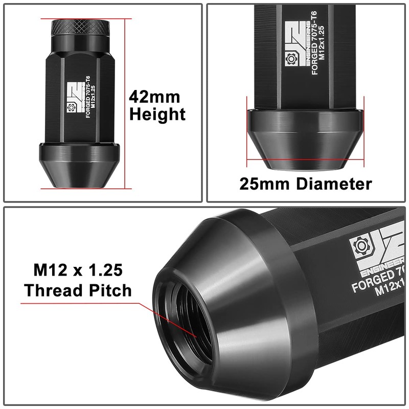 J2 Engineering J2-LN-T7-038-125-BK M12 x 1.25 T6-7075 Aluminum 42mm Closed End Lug Nuts w/Deep Drive Extension Adapter,Black