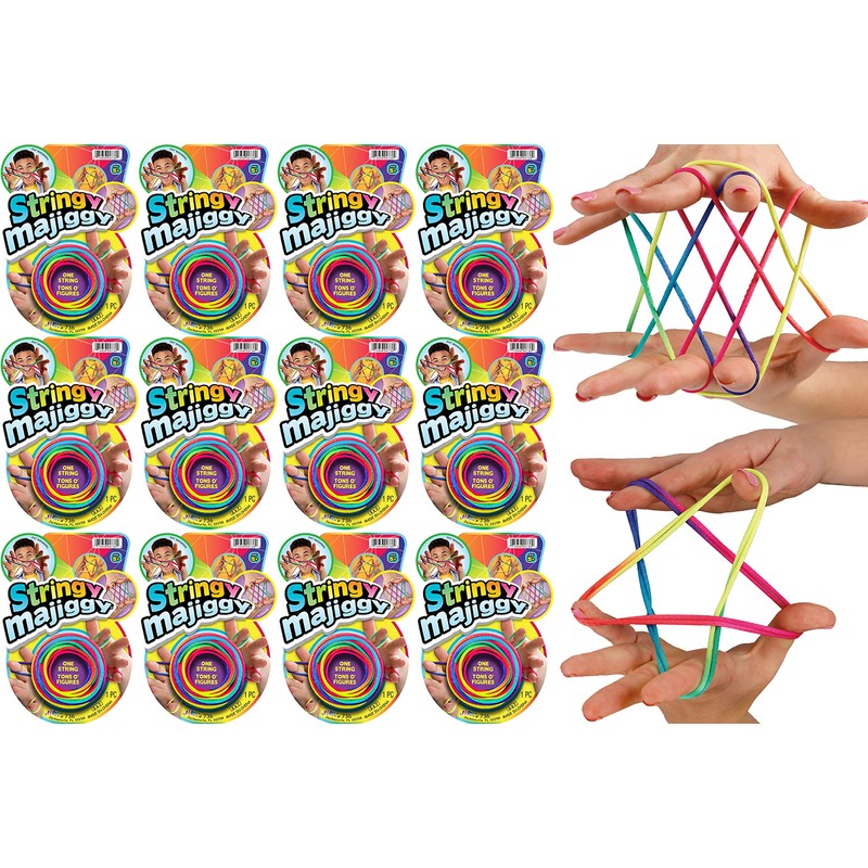 - 12 INDIVIDUALLY PACKED CATS CRADLE STRING TOYS - 65 inch long stretchy string. Colorful and rainbow neon colored rope. Includes a few tricks and how to's at the back of every package. Comes with 1 FunaTon Sticker.