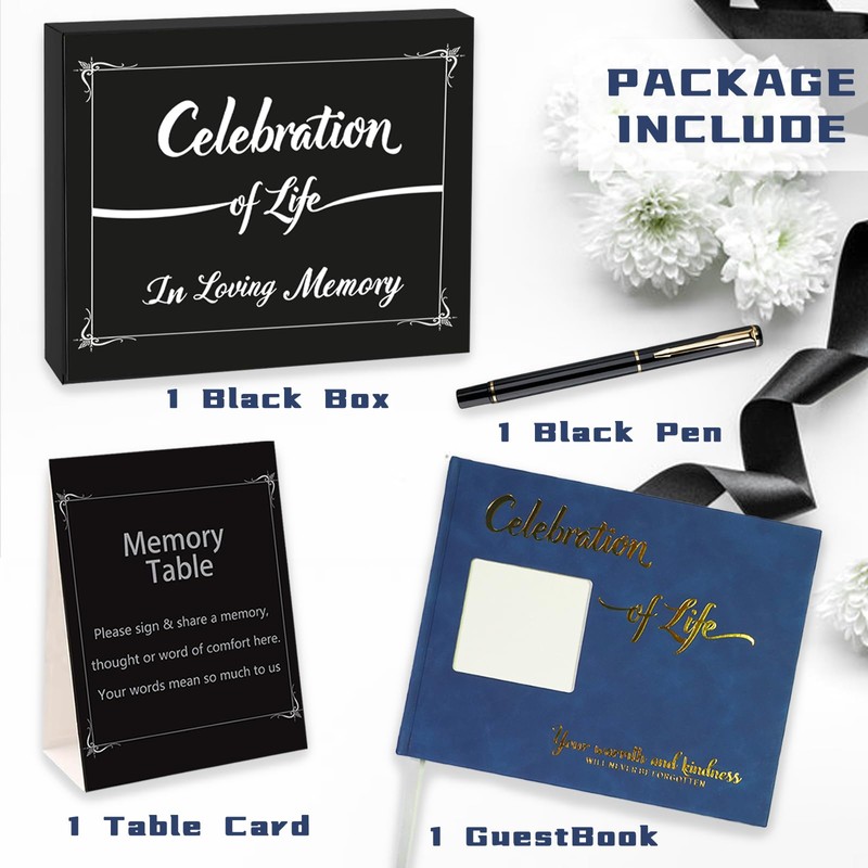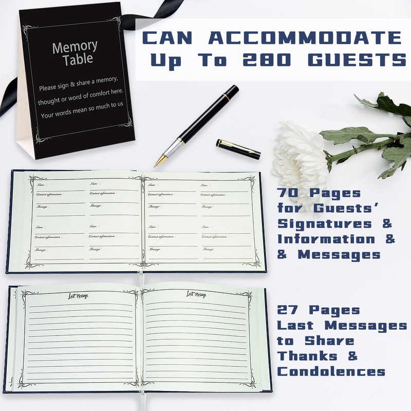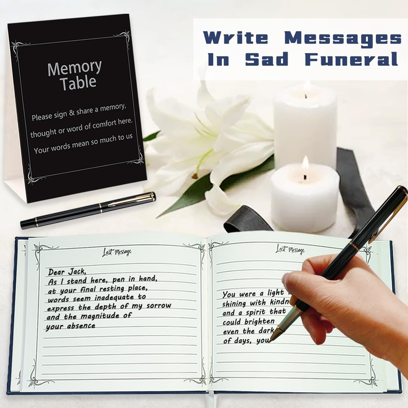 - 【1 Funeral Guest Book & 1 Black Pen & 1 Table Card】 Complete guest book set is perfect complement for funerals and wakes. Packaged in a solemn box, this funeral guest book with a ribbon bookmark can celebrate the memory of lost loved ones, black pen ads a touch of elegance and also gives a smooth writing feel to add those memories, including a memorial table top sign to direct guests to sign the book
