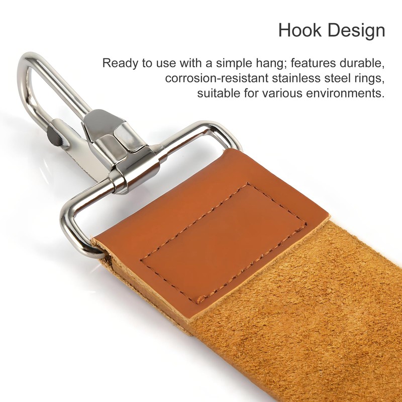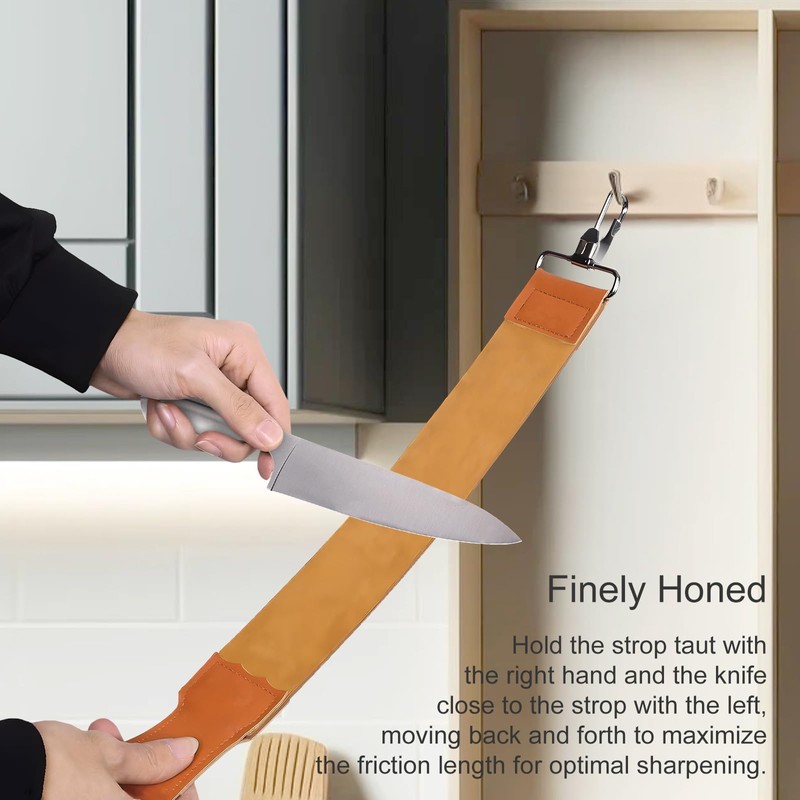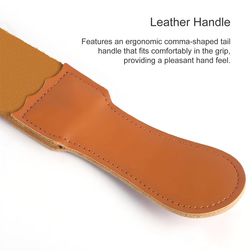 - The design of the strop is carefully balanced for ease of use, featuring a handle for a secure grip and a swivel hanging tab for convenient storage and access.