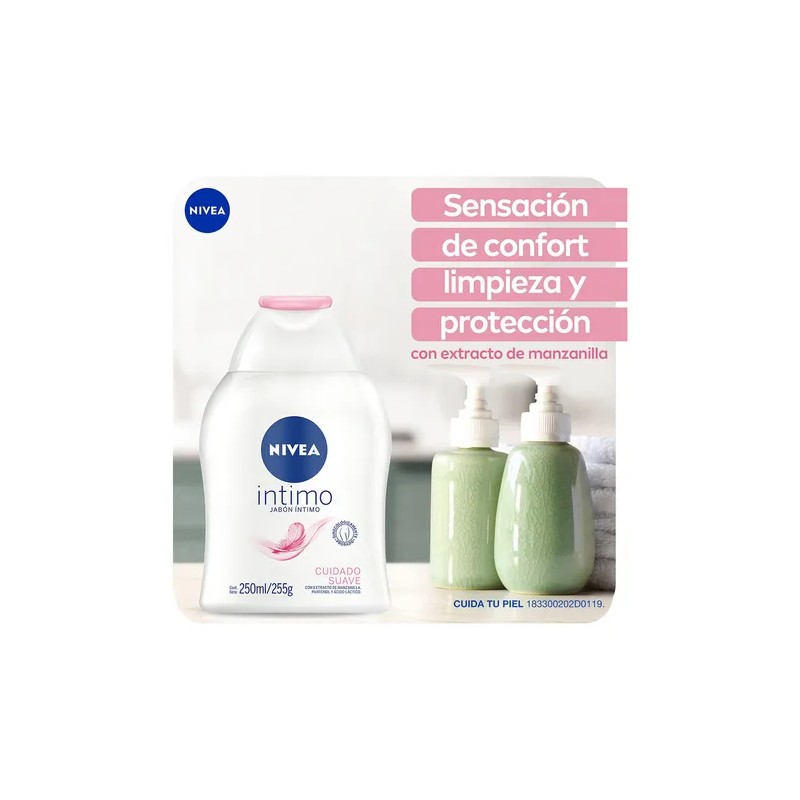 Jabón Íntimo Femenino Nivea Cuidado Suave 250 Ml es un producto diseñado para la higiene íntima diaria, que ayuda a mantener la piel hidratada y libre de irritaciones. Su fórmula equilibrada respeta el PH de la zona íntima, sin jabones alcalinos, y contiene extracto de manzanilla, pantenol y ácido láctico para una limpieza delicada. Ofrece una sensación de frescura y comodidad duradera.