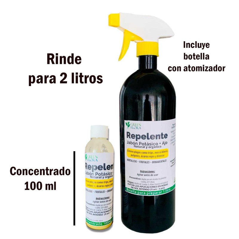 Incluye 3 botellas concentradas de 100 ml cada una, una botella vacía de 1 litro para la preparación y un atomizador para facilitar la aplicación.