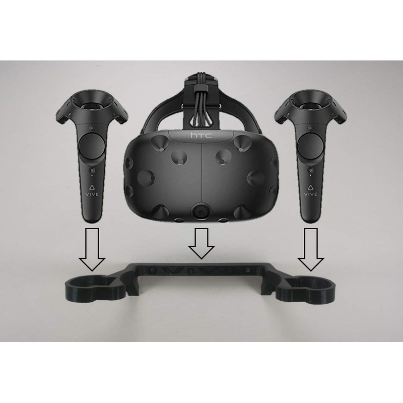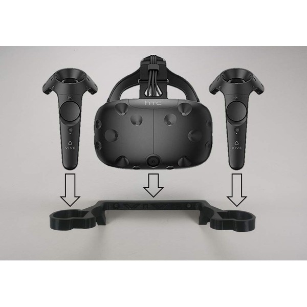 - A minimal wall mount system for the HTC Vive VR headset and two controllers.