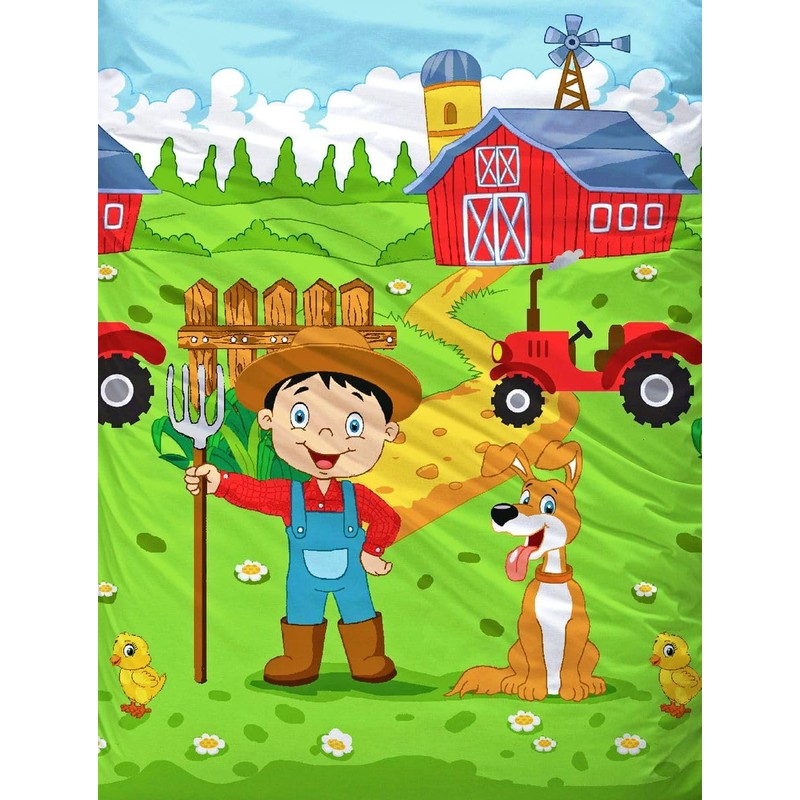 Tauchen Sie ein in die fröhliche Welt des Bauernhofs mit diesem bezaubernden Babybettwäsche-Set! Das liebevoll gestaltete Design zeigt eine farbenfrohe Bauernhof-Szene mit einem kleinen Bauern, Tieren, einem roten Traktor und einer Scheune - perfekt, um die Fantasie Ihres Kindes zu beflügeln und für eine gemütliche Atmosphäre im Kinderzimmer zu sorgen.
