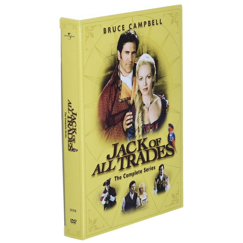_Jack of All Trades_ , starring Bruce Campbell ( _Evil Dead_ ) as Jack Stiles, and Angela Dotchin as his supervisor, Emilia Rothschild, is a campy, post- Revolutionary War-era comedy series that's fun because it's so bizarre. In each of the twenty-two episodes, Jack and Emilia, hired by Thomas Jefferson as undercover spies, fight French Imperialism while encountering history's greatest political celebrities. In a dynamic reminiscent of _Moonlighting_ , Emilia's feminist savvy for espionage is repeatedly undermined by Jack's dumb- but-sweet naïvete. Their brains and brawn combo is unbeatable, as they continuously foil conquest plans hatched by French Governor Croque (Stuart Devenie) and his cousin, Napolean Bonaparte (Verne Troyer, a.k.a Mini Me). No one is sacred in this series: French plans for takeover are always obviously revealed in one idiotic swoop, as if the Governor and Napolean are The Joker and The Penguin in vintage _Batman_ episodes. Jack, master of one-liners like, "Beat it turkey, Im having Thanksgiving," pokes fun at America's love of corny jokes. Plots, too, are ridiculous. In "X Marquis the Spot," Jack and Emilia visit Marquis de Sade's "Agony Island" in search of King George's crown. De Sade, clad in absurd red and black leathers, forces everyone to wear leashes and engage in S&M master/slave tactics. In "Shark Bait," Jack and Emilia enjoy a submarine ride in a machine that looks like a giant, Victorian fish, when their sub is swallowed by Leonardo da Vinci's great, great, great, great grandson, Captain Nardo's bigger sub. Scripted fantasy elements commingle with slapstick humor, satire, and physical comedy in this odd show destined for cult classic status. With Sam Raimi as executive producer and Eric Gruendemann and Josh Becker, of _Hercules_ and _Xena_ fame, as directors, _Jack of All Trades_ got that extra dose of twisted, off-color humor needed to make it a truly original show. _\--Trinie Dalton_
