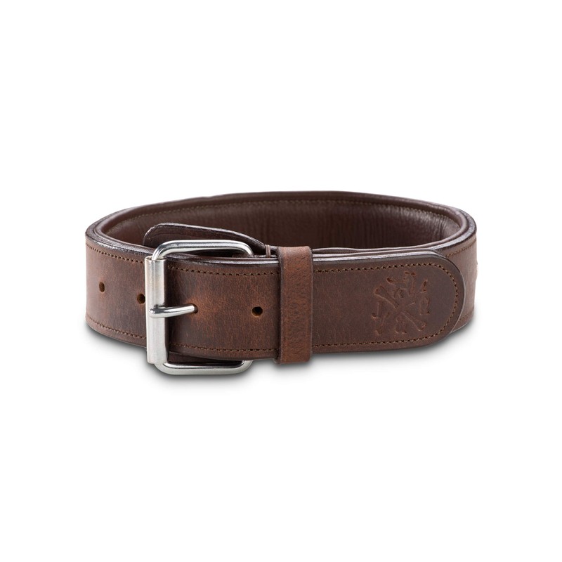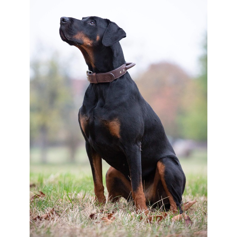 Our premium dog collar "Jack" is specially made for large dog breeds and is perfect for education and training or for guiding guard dogs. It has all the features that are necessary for this: the extremely sturdy buffalo leather on the outside remains in shape even under extreme loads. The leather is sewn around a tear-resistant rope on the handle and therefore sits very well in the hand. On each side, two rivets support the robust seam that connects the handle to the collar, ensuring reliable durability even under very strong pull. The cowhide nappa leather on the inside is hammered on the edges and softly lined, which creates a high level of comfort and protects the dog's larynx. The width of the collar distributes pressure evenly, the tab under the buckle also protects fur and dog neck. For dog tag and lead, there is a D-ring under the handle, which is made of weather-resistant stainless steel, like the clasp. Even the tried and tested Jack & Russell design is not too short - the high-quality leather mix in classic warm brown is finely tanned, the matte upper leather impresses with a soft grip.