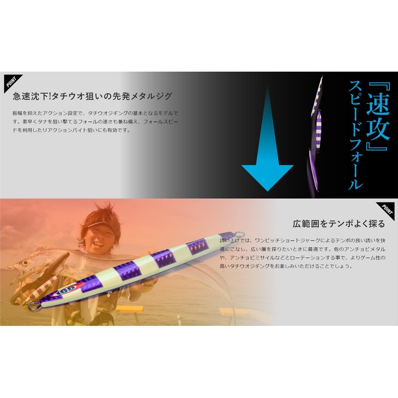 • Concept: Type 1: A speed type with a focus on repetitioning a wide area. The first metal jig is perfect for those who want to explore a wide layer with the "Reaction & Range Search" that utilizes fast fall speed