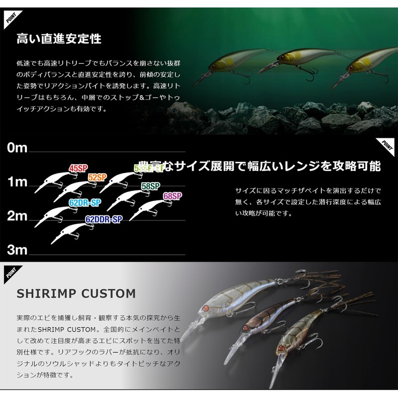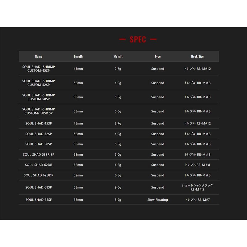 - Type: Soul Shad 58SP. Original model. The size is frequently used regardless of the field, so it can be used as a tackle box anytime, anywhere
