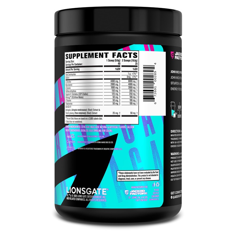 Jacked Factory X John Wick - Wick Mode Pre Workout Powder - Intense Energy, Battle-Ready Focus, Unstoppable Commitment, and Sheer Will - 40 Servings, Baba Yaga Blue Raz