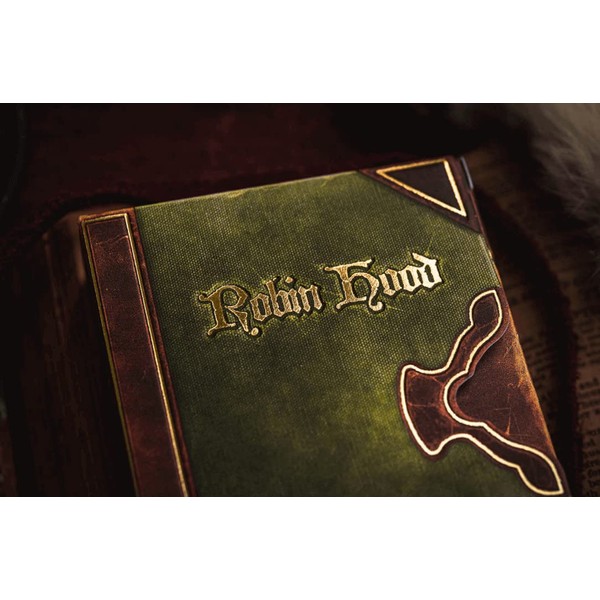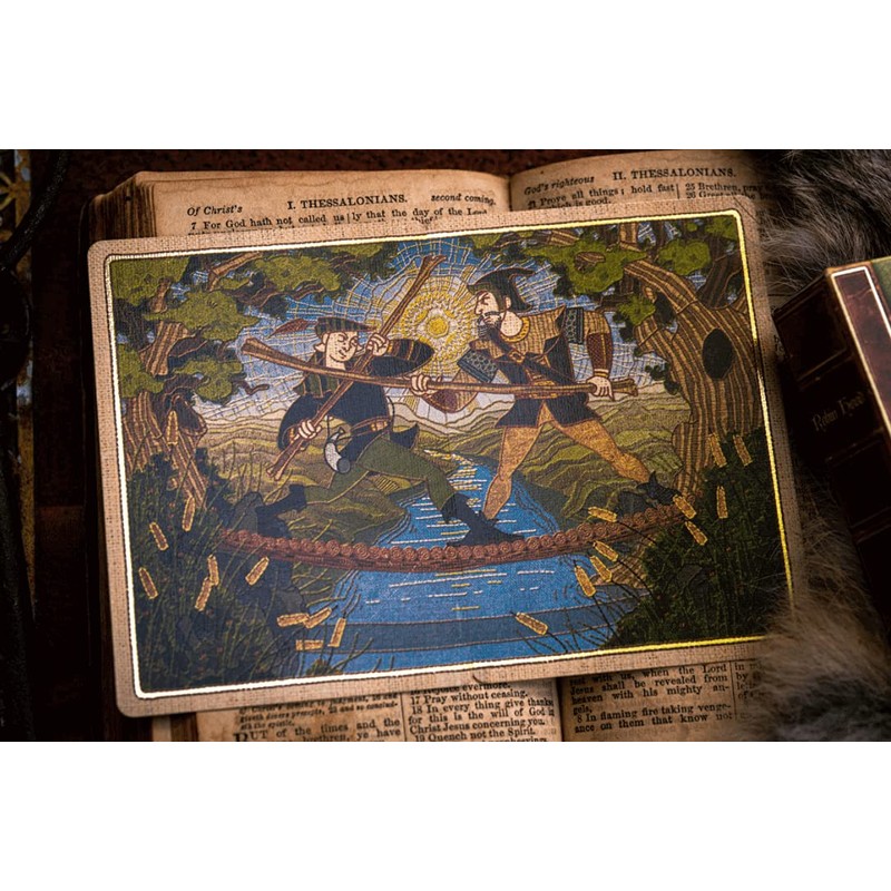 The unique artistic style achieved with the Robin Hood playing cards was inspired by the Bayeux tapestry. If you look closely at each card, you will find that designer Jackson Robinson has drawn every stitch by hand. The tuck has been intricately designed to resemble an old book, including lifelike features that resemble canvas and leather design work, a book spine, frayed paper edges, and with realistic wear details. The Diptych Jokers from the Robin Hood Deck feature the legendary first encounter of Robin Hood and Little John. ◎