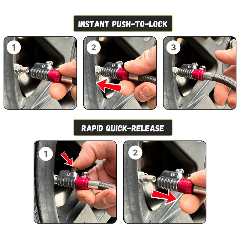 - QUICK-RELEASE: Instantly disconnect from the tire valve with zero air loss using the quick-release button.