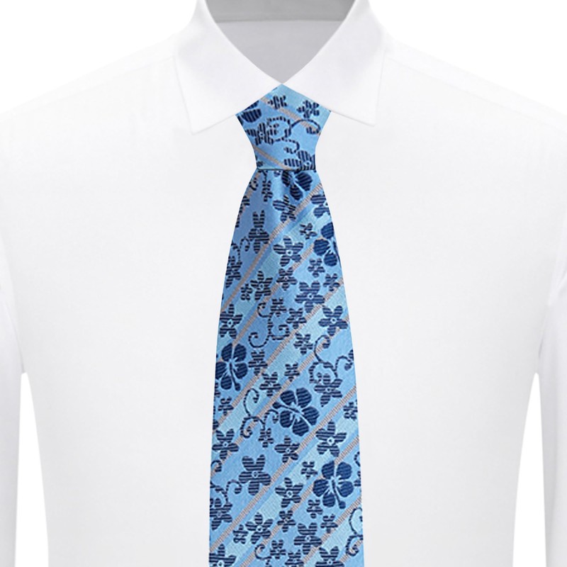 • Men's regular self-tie neck tie in floral blue taupe pattern.