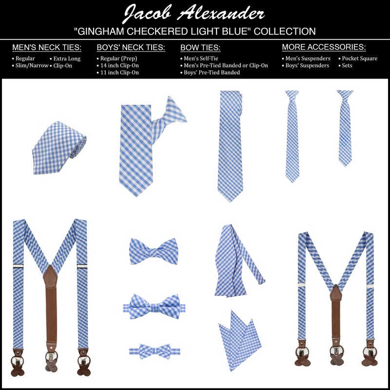 - Jacob Alexander también lleva corbatas de cuello a juego, pajaritas, cuadrados de bolsillo y tirantes, tanto en tamaños de hombres como para niños.
