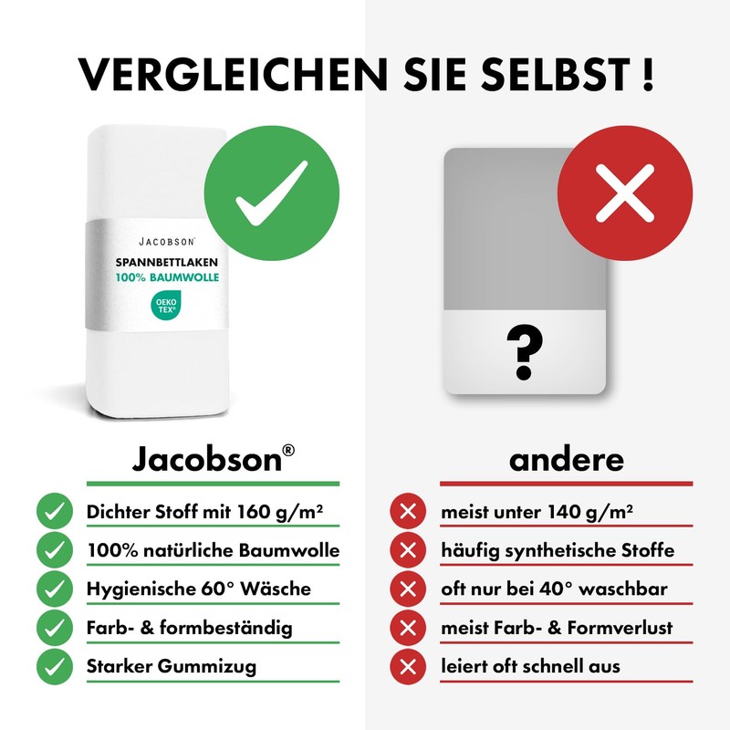 - Jacobson BASIC fitted sheet: The Jacobson brand stands for the highest standards in terms of quality, feel and aesthetics. The 140 x 200 cm - 160 x 200 cm fitted sheets are suitable for mattresses with a base height of up to 23 cm.