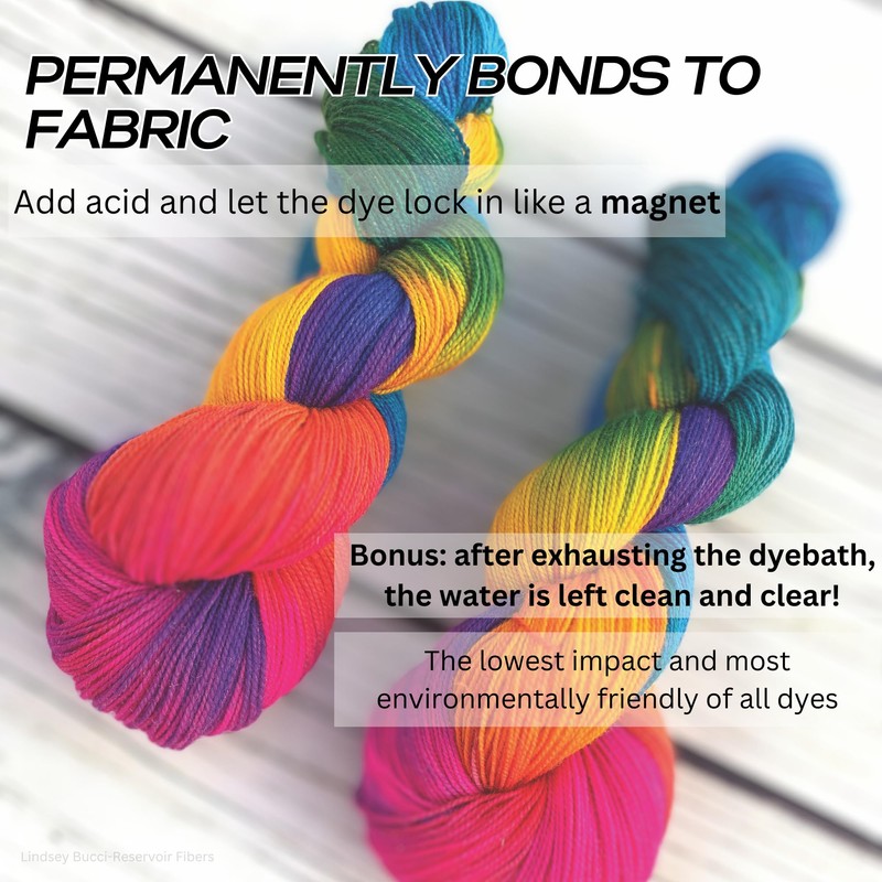- Permanently Bonds to Fabric - Once the acid is added to the dye solution, the dye "magnetizes" to the material and bonds with the fibers. This also means the dye is pulled out of the water, leaving you with clean water to dispose of after the dyeing process, making clean up a breeze
