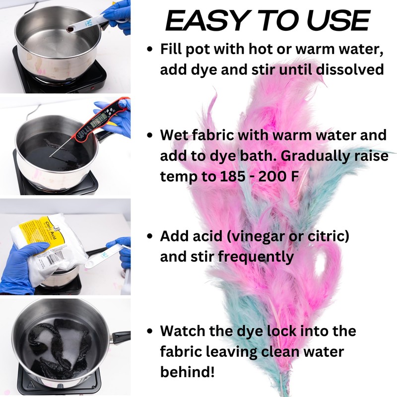 - Easy to Use - Heat the water to 180 degrees F (80 degrees C) then add the dye. Add wet fabric to the dye mixture, then add chosen acid (vinegar or citric acid). Acid Dyes are stable in solution, allowing you to save the dye bath or stock solution for future use