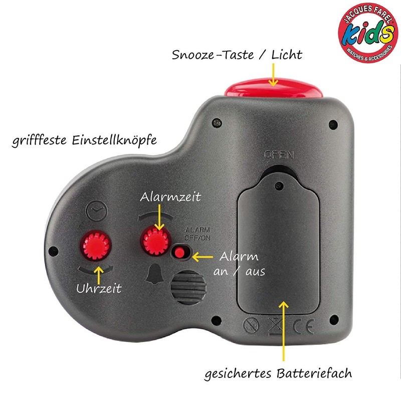 - 4-stufiges Wecksignal Piepton, griffige Einstellknöpfe, Hinten-Absteller, gesichertes Batteriefach, Batterie: 2x AA / 1,5 V (nicht im Lieferumfang enthalten)