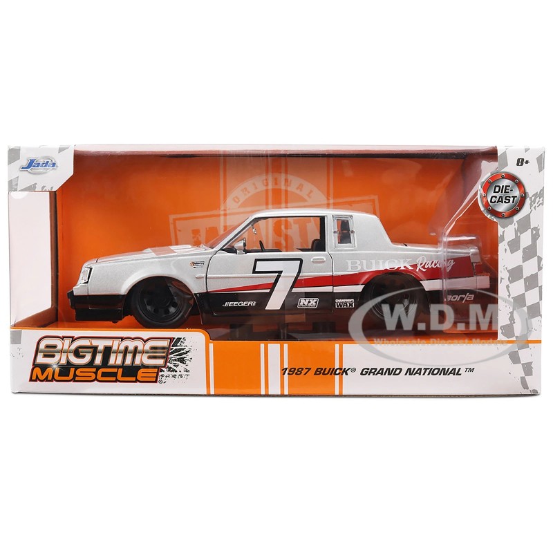 - Brand new 1/24 scale diecast model car of 1987 Buick Grand National #7 "Buick Racing" Matt Silver Metallic with Red and Black Stripes "Bigtime Muscle" Series die cast car model by Jada.