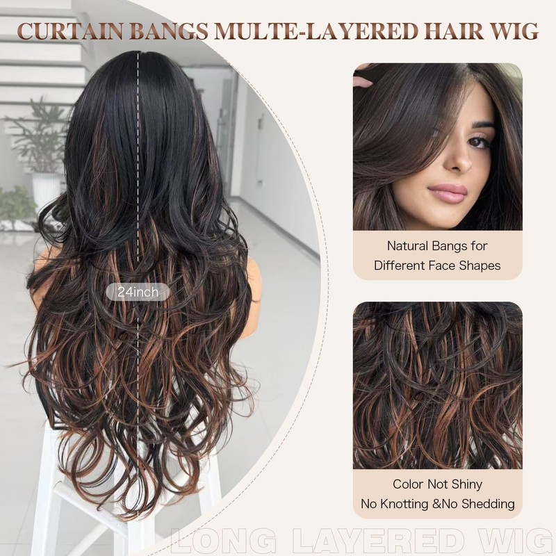 - Long black mixd brown Highlight Layered Curtain Bangs Wig:Highlight Dark Brown layered wigs with bangs for black white women and girl is made of high-temperature resistant synthetic fiber. The curtain bangs and center-parted design modify the face shape, creating a charming and natural shape, modifying the face shape, making you more confident, elegant and charming. This long dark blonde highlight layered wavy shaggy wig is 24 inches long and easy to wear and maintain. You can trim the bangs and wig length according to your preferences, making you a unique existence in the crowd.