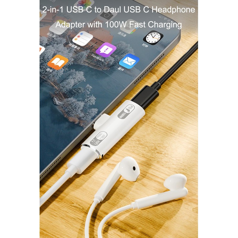 Jadebones USB C Splitter with 100W Fast Charging, Dual USB C Headphone and Charger Adapter Dongle for iPhone 16/15 Series, iPad, MacBook, Galaxy S24/S23 and More (White)