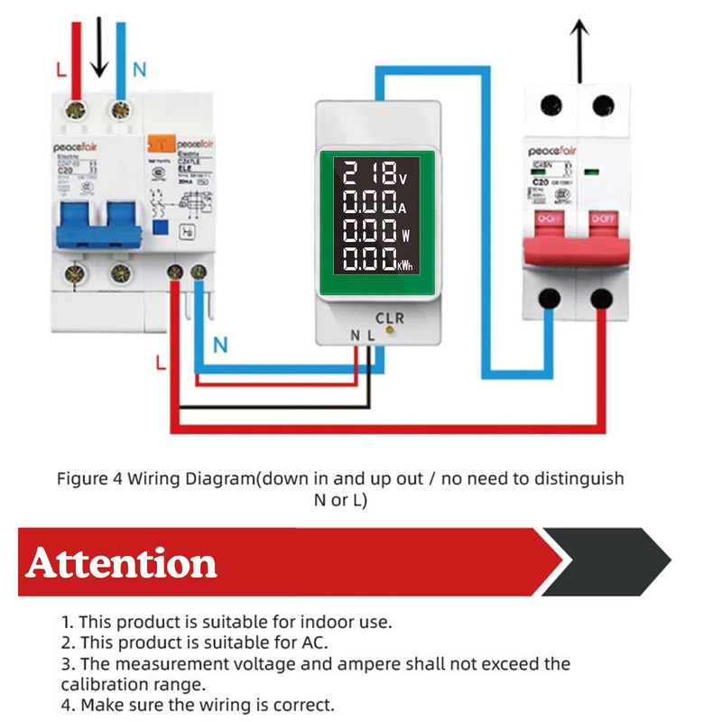 - 5. Warm tips: the energy meter is suitable for indoor use, only for AC current. Measured voltage and amperage must not exceed the calibration range with correct wiring