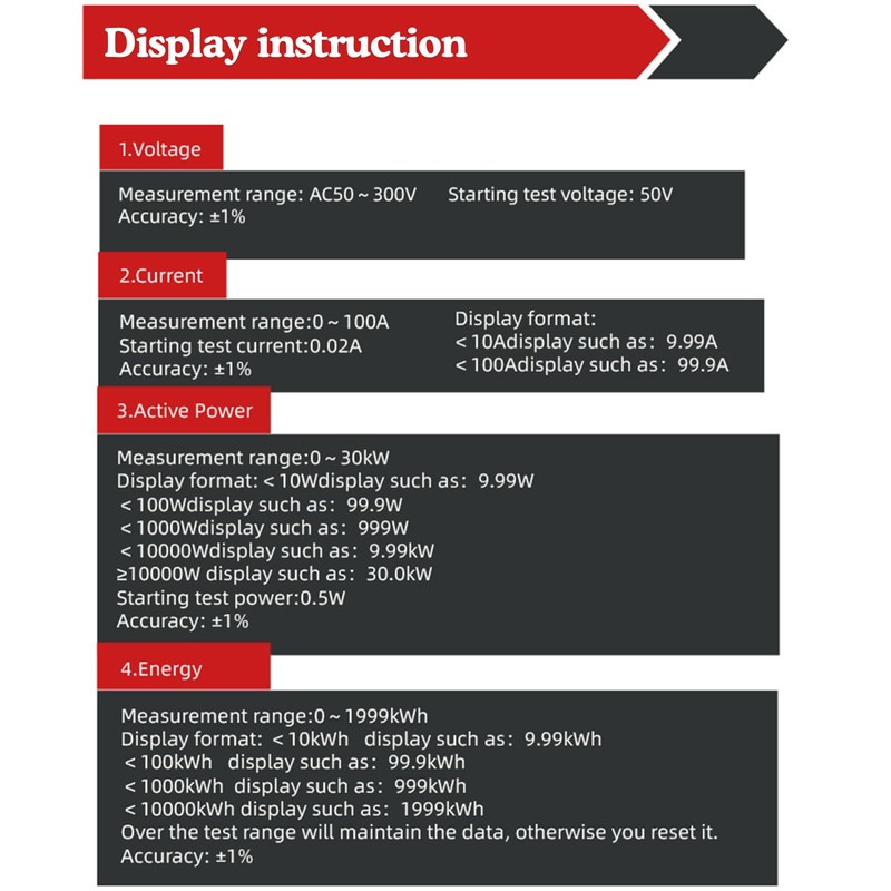 - 2. Display: the power meter has LCD display with backlight, clear reading, supply voltage of meter: AC 50V-300V; Current: 0-100A; Active power: 0-30kW; Electrical energy: 0-1999kWh