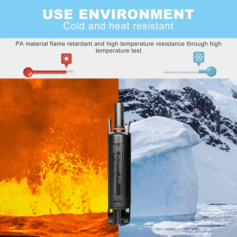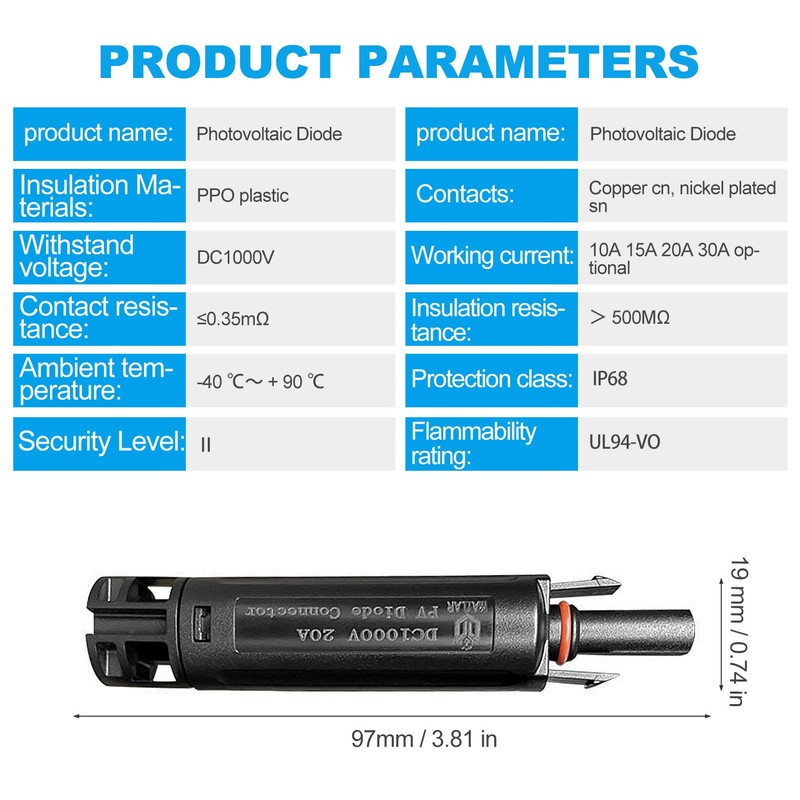 - 4. 【Parameters】: Solar PV diode plug, manufactured according to standard procedures, the rated current of the diode plug is 10A, 15A, 20A, 30A optional, rated voltage: DC1000V, temperature range: -40℃ - +90℃, flame retardant class: UL94- VO.