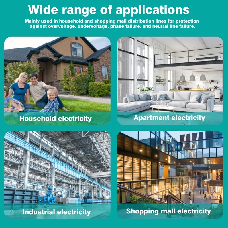 - 【Automatic Shutdown in case of Overload】: If there is an overvoltage error, undervoltage error or over-current error in the line, this over-voltage and undervoltage protector can immediately interrupt the power supply to protect the electrical equipment from burns. When the line is back to normal, the protector can automatically connect the line.